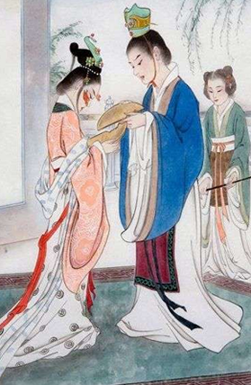 南朝陳國將亡時,駙馬徐德言預(yù)料妻子樂昌公主將會被人掠去,于是打破一面銅鏡,各拿一半,作為日后重見時的憑證,并約定每逢正月十五日,就在市集賣這半面鏡子,以探聽對方的消息。陳國亡后,樂昌公主為楊素所占,徐德言每逢正月十五日便到京城賣鏡,年復(fù)一年,終在某年見到一人叫賣破鏡,與所藏半鏡相合,于是題詩曰:“鏡與人俱去,鏡歸人未歸。無復(fù)嫦娥影,空留明月輝。”樂昌公主見到此詩,悲泣不食。楊素知道此事后,便讓公主與徐德言重新團圓。